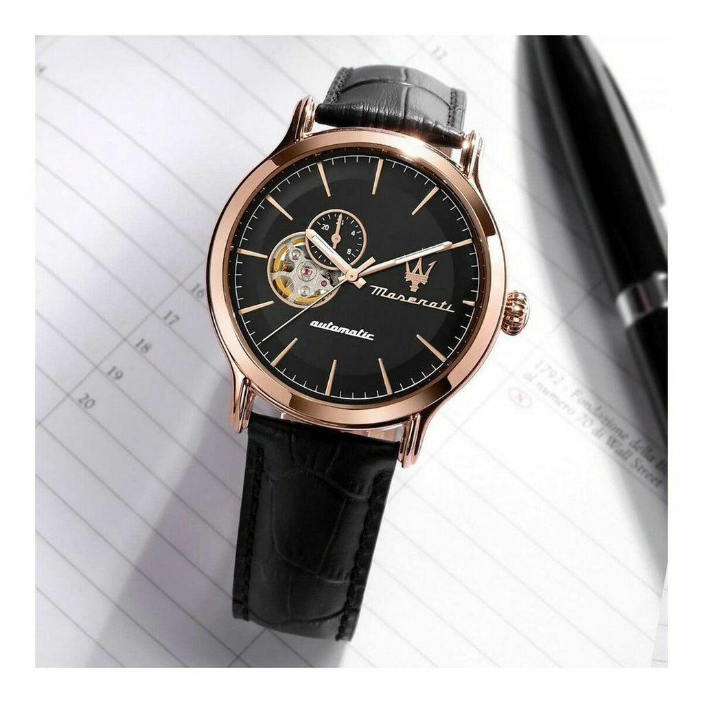 Entdecken Sie die Maserati EPOCA AUTOMATIC, eine luxuriöse Automatikuhr, die durch ihr exklusives Design und die erstklassige Verarbeitung besticht. Mit einem Gehäusedurchmesser von 42 mm und der raffinierten Kombination aus roségoldenem Edelstahlgehäuse und schwarzem Lederarmband verkörpert diese Uhr italienische Eleganz und automobile Leidenschaft der legendären Luxusmarke Maserati.