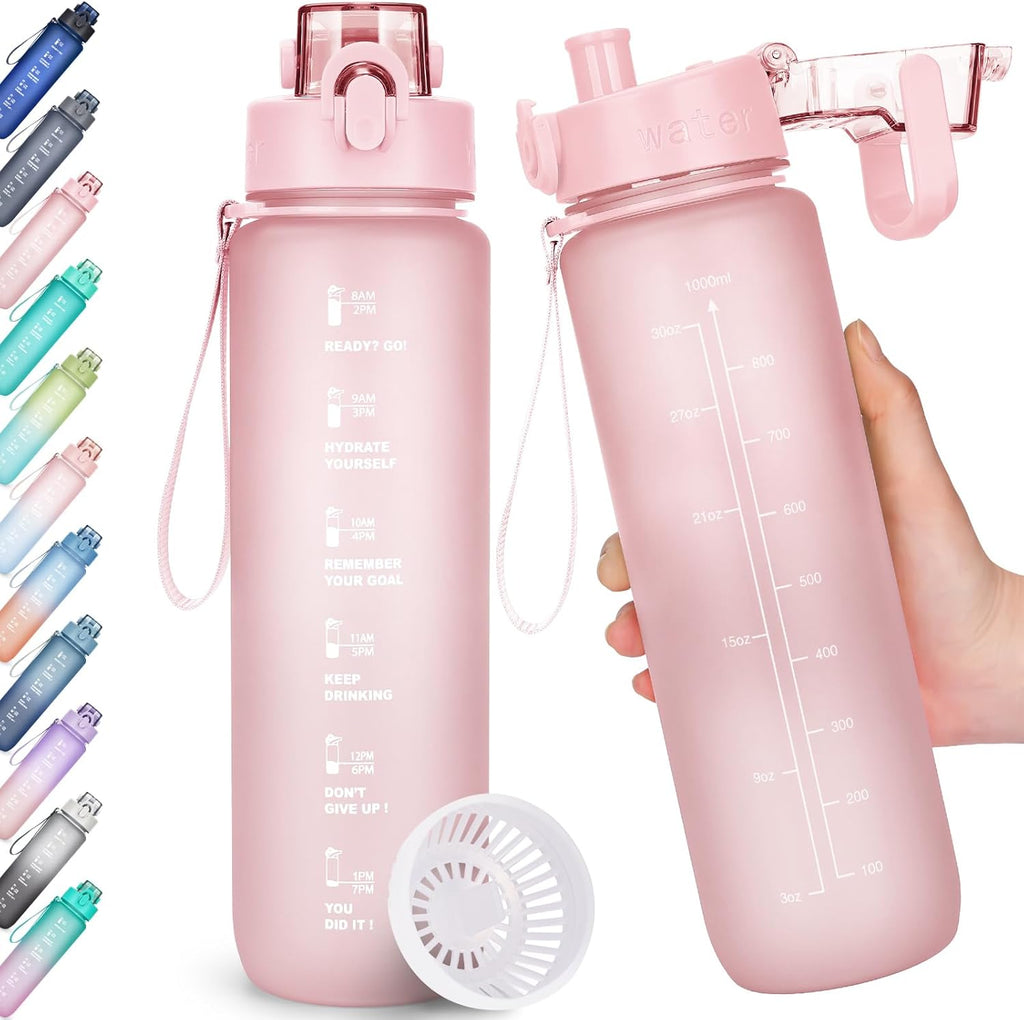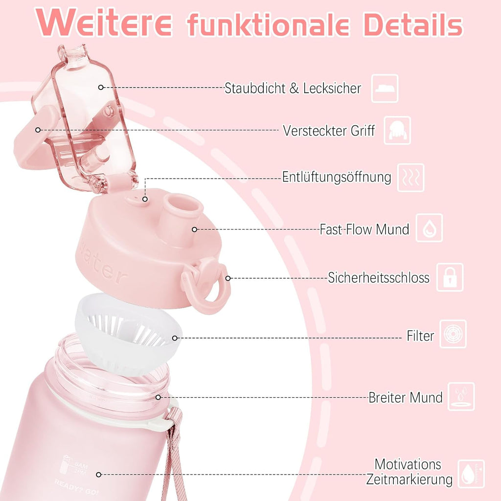 Praktische 1 Liter Trinkflasche aus BPA-freiem Tritan-Material mit hilfreichen Zeitmarkierungen für optimale Flüssigkeitszufuhr über den Tag. Die auslaufsichere Flasche ist leicht und robust – perfekt für Büro, Schule, Yoga oder Outdoor-Aktivitäten.